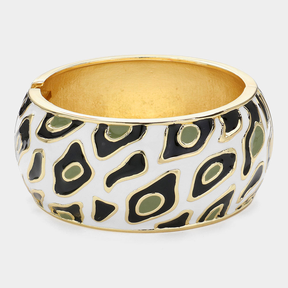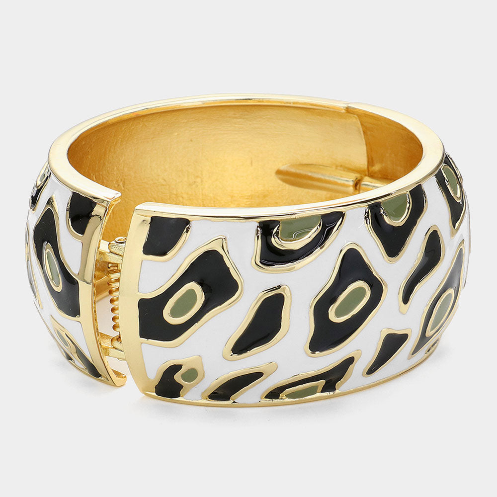 Enamel Leopard Print Hinged Bangle Bracelet (Gold)