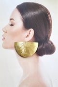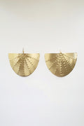 Gold Fan Earrings! Made of brass metal, they feature a unique fan design and hand stud details for a playful touch. Measuring 4 inches in length, they're sure to make a statement.